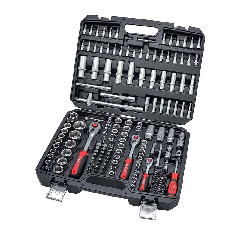 Dieser hochwertige Ratschenkasten überzeugt durch eine große Auswahl an Stecknüssen, Verlängerungen und Bits – ideal für präzises Schrauben in Werkstatt, Garage oder unterwegs. Gefertigt aus robustem Chrom-Vanadium-Stahl steht er für außergewöhnliche Langlebigkeit und Zuverlässigkeit – auch unter hoher Belastung.